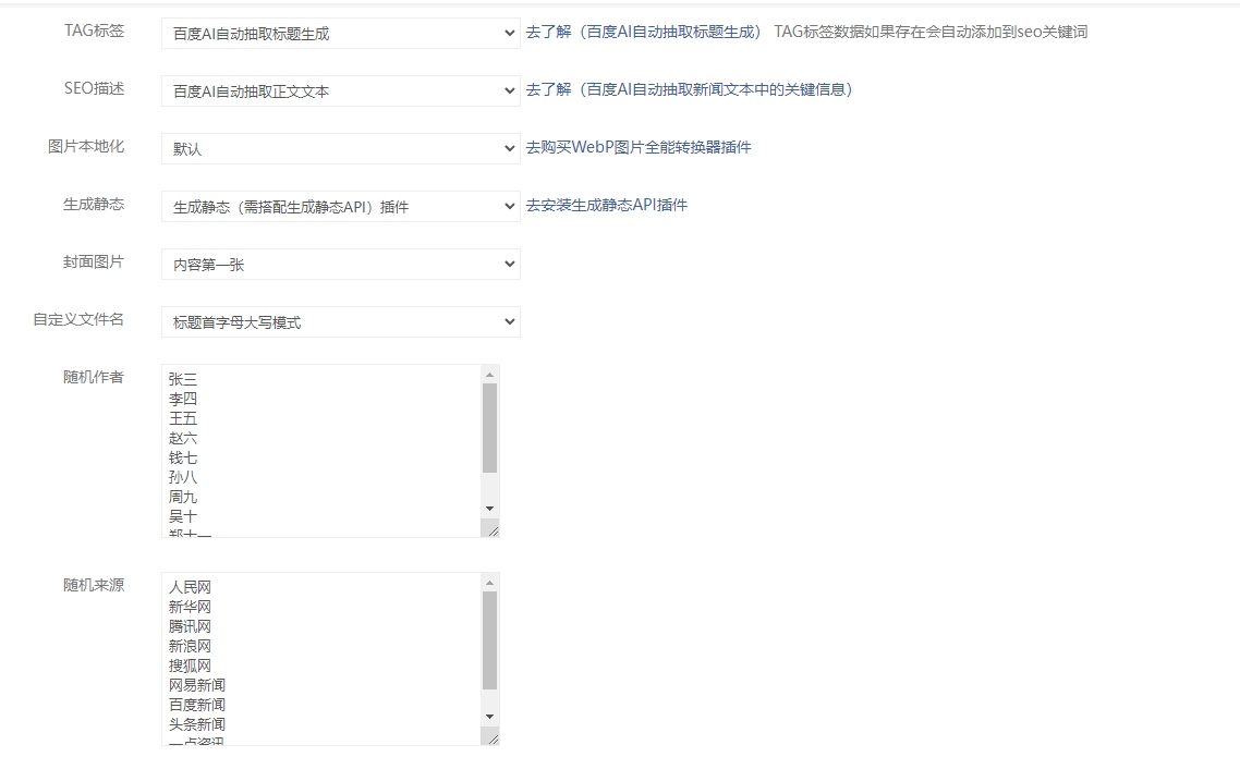 本插件支持单选,多选,下拉,多图,单图,附件,以及图片集,TAG,编辑器入库,真正做到,任何数据皆可入库,支持URL规则定制且自动生成静态(默认提供火车头入库模块)